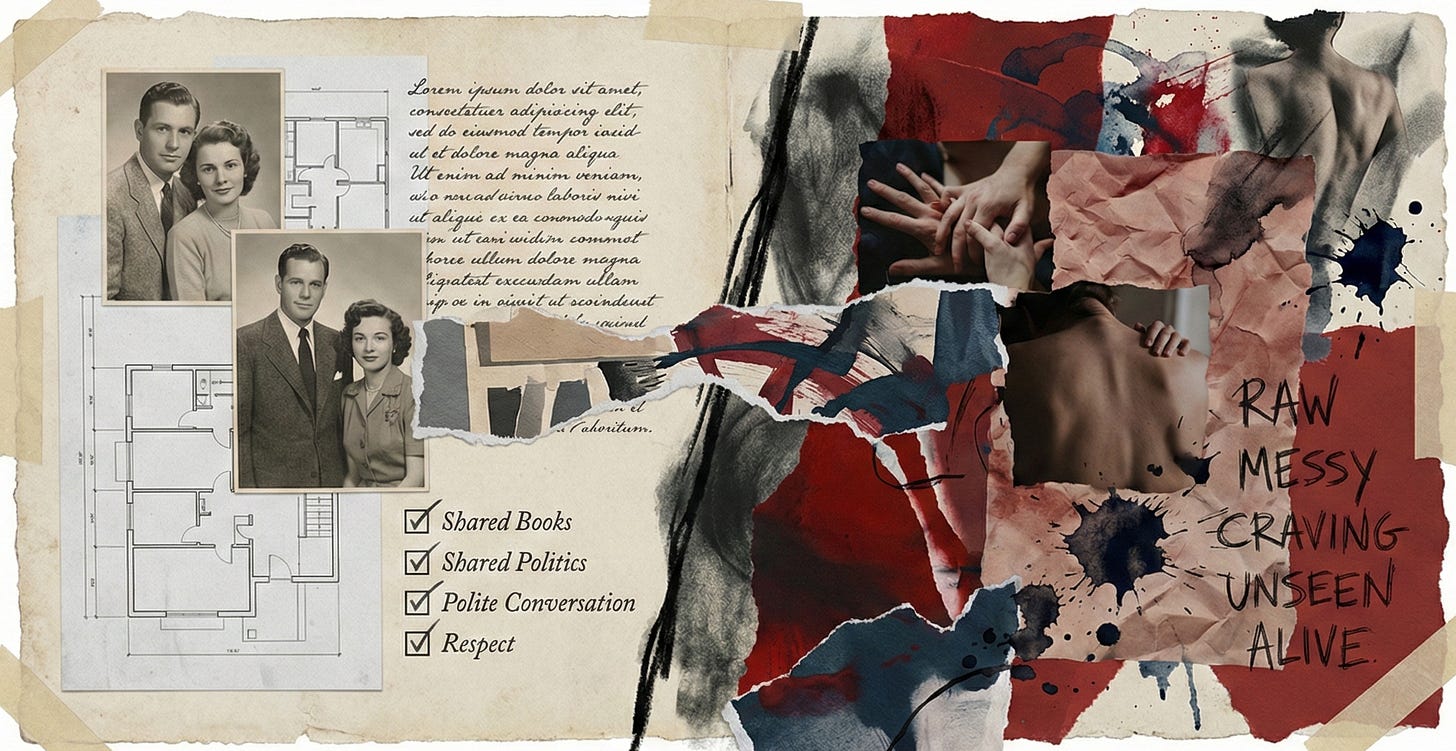 Eventually, the body keeps score. The resentment builds. We become roommates who agree on politics but can’t touch each other because the gap between who we are pretending to be and who we actually are has become too wide to cross.